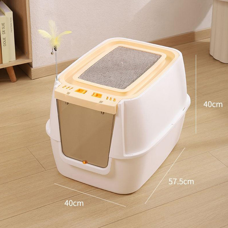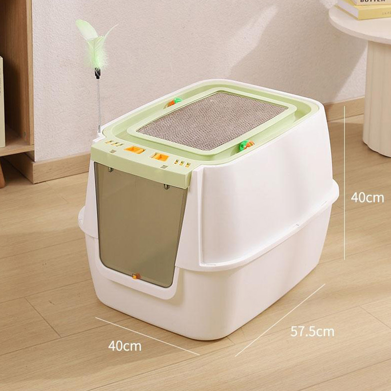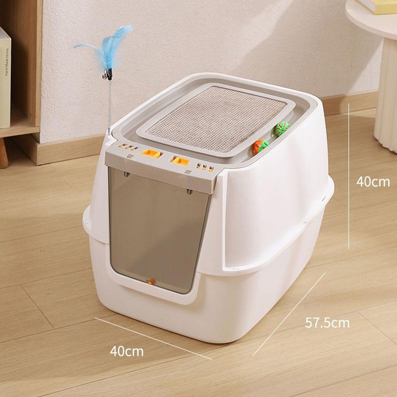 صندوق فضلات القطط ذو الغطاء العلوي المغلق بالكامل مع عصا تشويقية وكرة متدحرجة