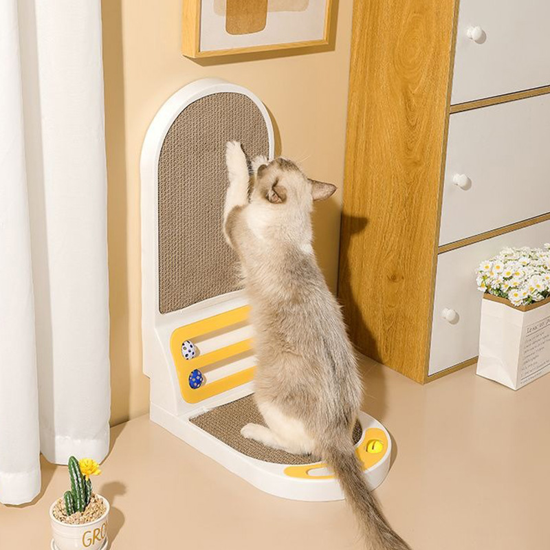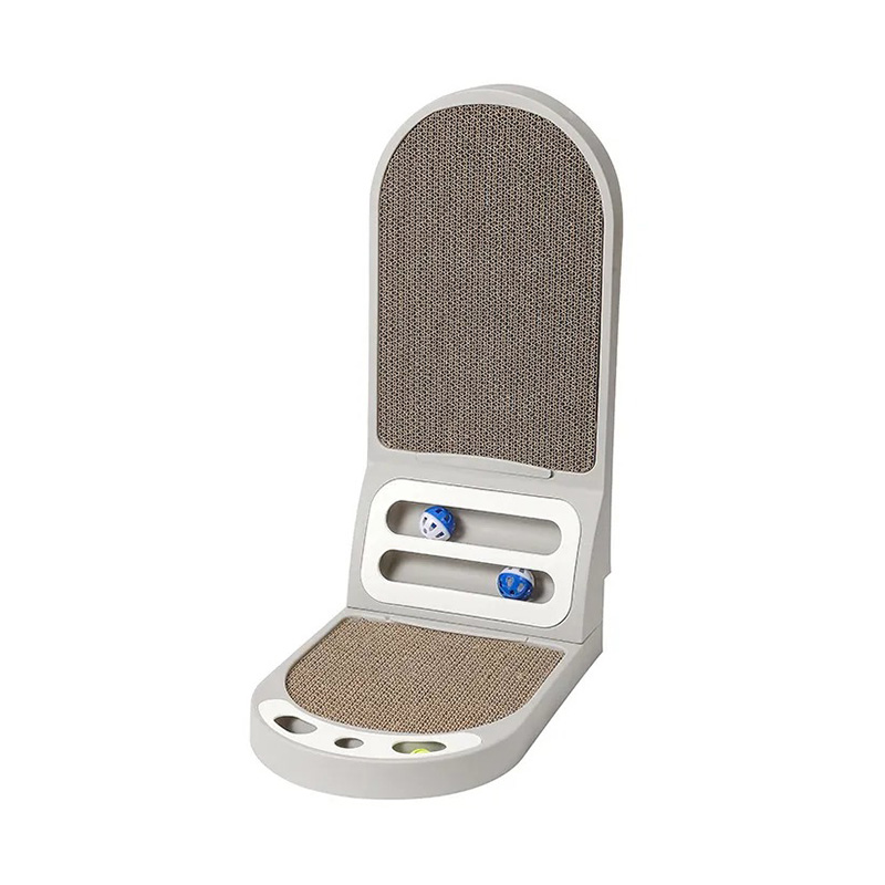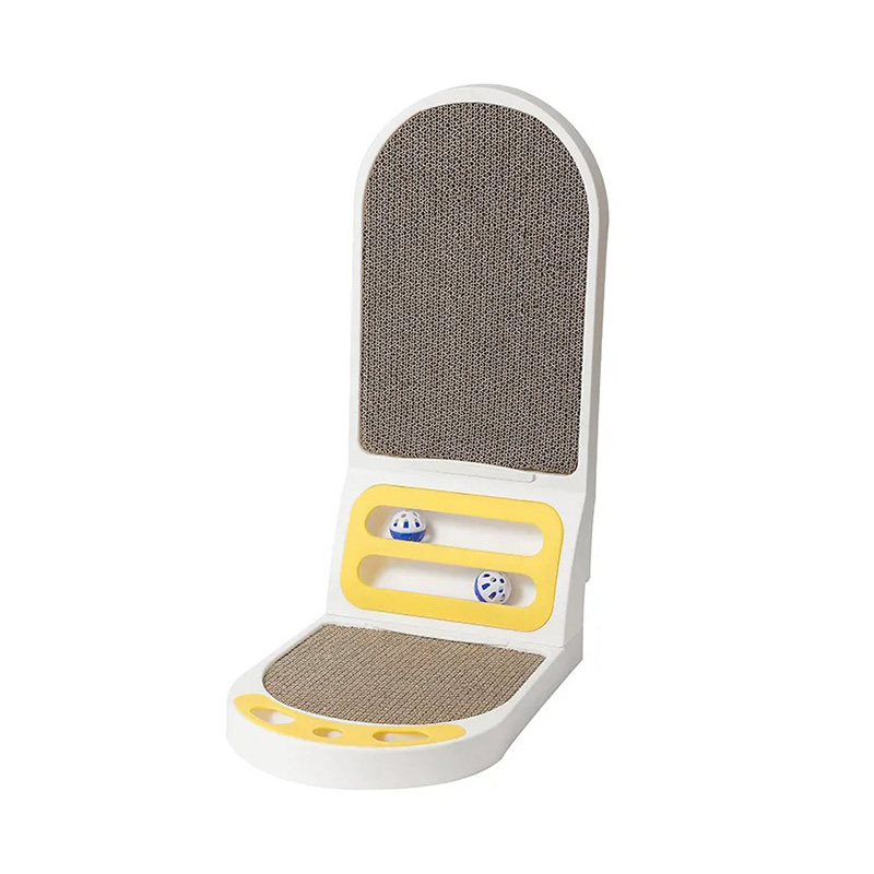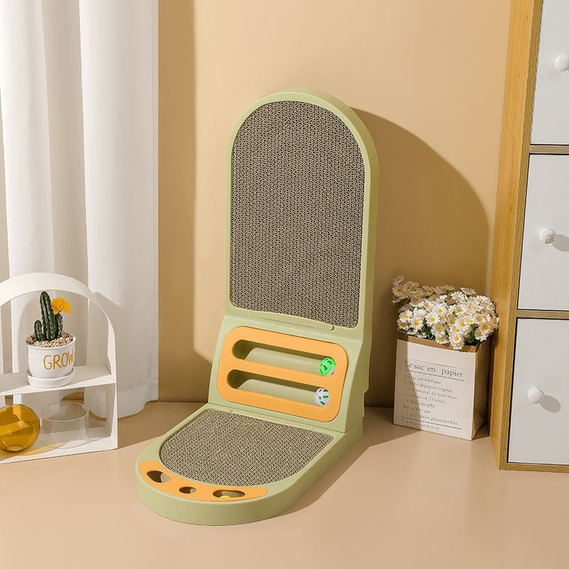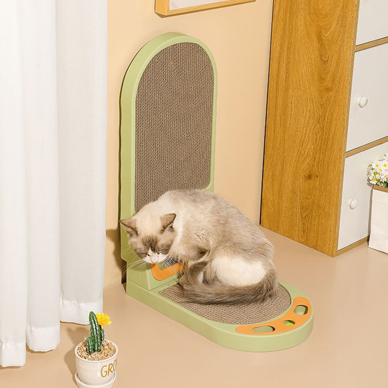 تتميز أداة الخدش باللون الأخضر في المقام الأول مع لمسات برتقالية، مما يضيف لمسة نابضة بالحياة إلى مظهرها. تم تغطية السطحين العلوي والسفلي بمادة مموجة متينة توفر ملمسًا مثاليًا للقطط لشحذ مخالبها. يتضمن القسم الأوسط لعبتين مدمجتين للقطط، تم تصميمهما لإشراك وترفيه رفاق القطط، وتشجيعهم على استخدام أداة الخدش بانتظام.