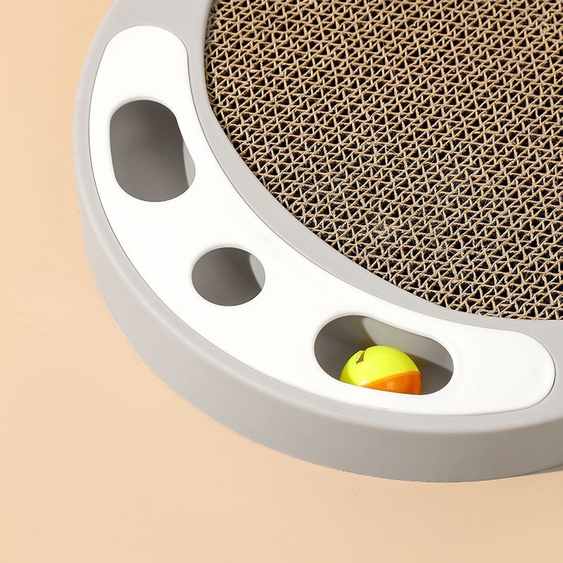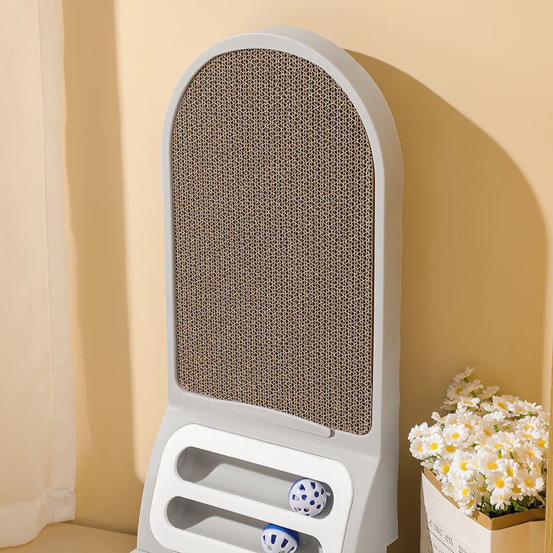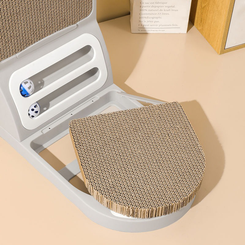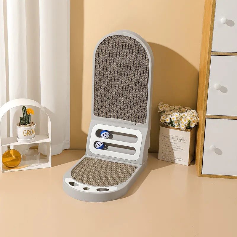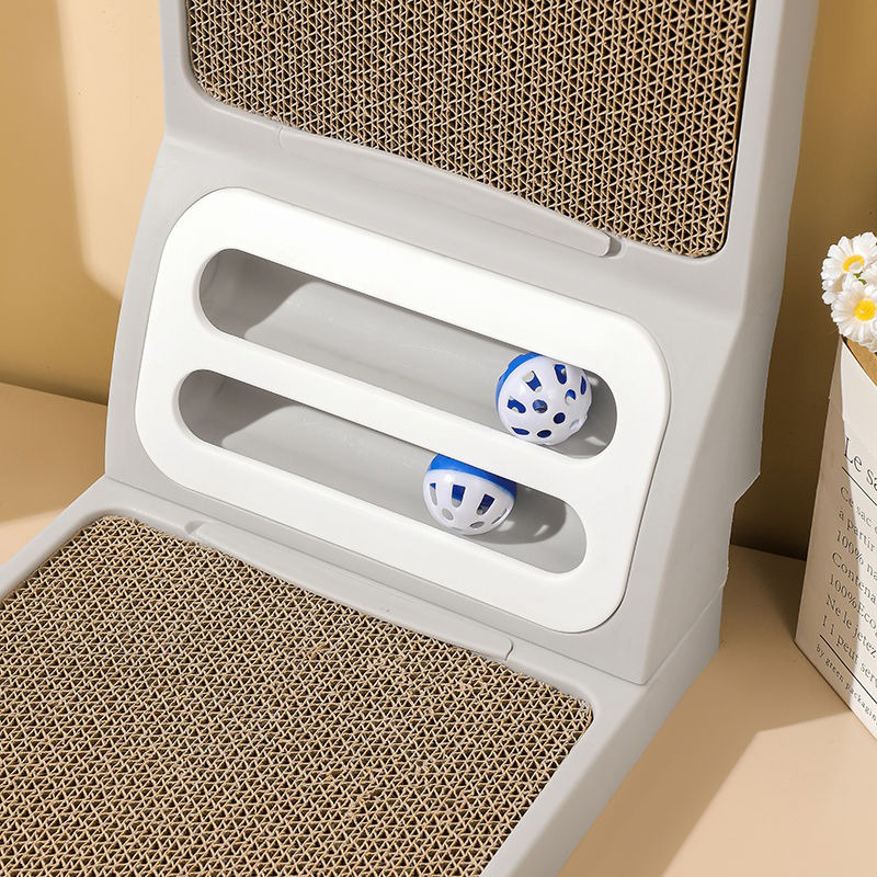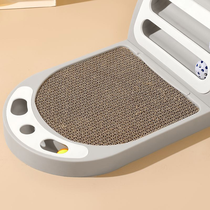 تتميز أداة الخدش باللون الأخضر في المقام الأول مع لمسات برتقالية، مما يضيف لمسة نابضة بالحياة إلى مظهرها. تم تغطية السطحين العلوي والسفلي بمادة مموجة متينة توفر ملمسًا مثاليًا للقطط لشحذ مخالبها. يتضمن القسم الأوسط لعبتين مدمجتين للقطط، تم تصميمهما لإشراك وترفيه رفاق القطط، وتشجيعهم على استخدام أداة الخدش بانتظام.